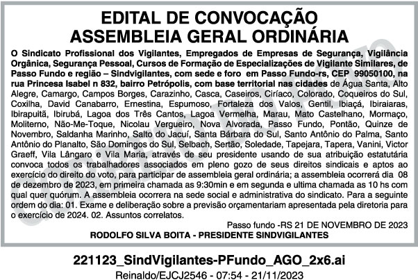 DOS VIGILANTES DE PASSO FUNDO E REGIÃO; EM PRIMEIRA CHAMADA AS 9:30 E SEGUNDA CHAMADA AS 10:00. REFERENTE A PREVISÃO ORÇAMENTARIA APRESENTADA PELA DIRETORIA PARA 2024