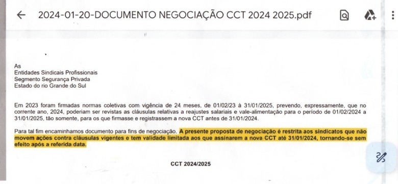 Logo em seguida enviamos o texto sendo cópia fiel do artigo (484) rescisão por mutuo acordo embutida pelos patrões na CCT 2023/2024 na clausula manutenção do emprego, distorcida pela vontade deles suprimindo parte do aviso prévio, na ocasião o novo texto foi enviado e recusado pelo representante jurídico deles que disse ao nosso, vocês nunca vão conseguir isso, o Sindicato dos Vigilantes de Passo Fundo e Região moveu então ação anulatório da referida clausula - (0024621-25.2023.5.04.0000) e em 10/11/2023 saiu sentença- vitoriosa com apoio do MPT inclusive- em 1° instancia a este sindicato que é na atualidade o único protetor do direito dos trabalhadores, os patrões não satisfeitos entraram com recurso e o processo segue tramitando em instancia superior.