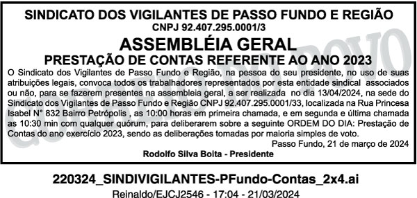 Será realizada Assembleia Geral de prestação de contas do ano de 2023 no dia 13/04/2024 sábado , em primeira chamada as 10:00 e em segunda chamada as 13:30. Ao final da assembléia será realizado almoço para os que estiverem presentes.