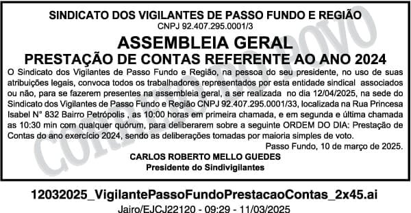 ORDEM DO DIA: Prestação de Contas do ano exercício 2024, sendo as
