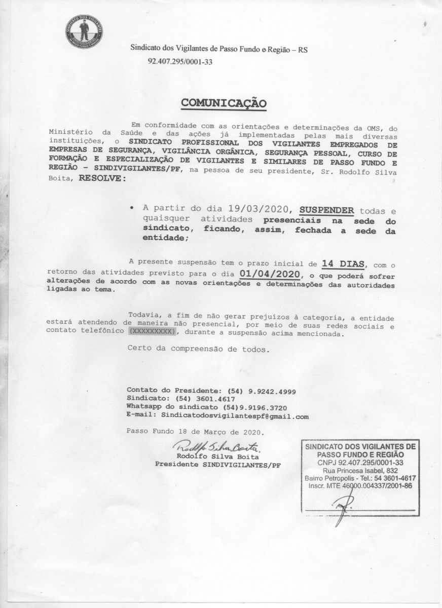 A partir do dia 19/03/2020, as atividades presenciais na Sede do Sindicato estarão suspensas, tem o prazo de 14 dias com retorno as atividades prevista para o dia 01/04/2020, podendo sofrer alterações de acordo com as novas orientações e determinações das autoridades ligadas ao tema.
