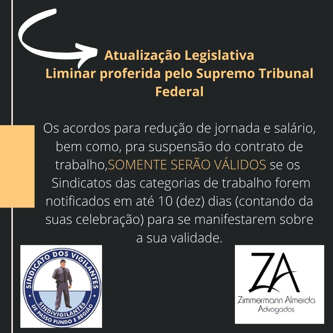 Diante da Pandemia do Coronavírus e das atualizações na legislação trabalhista em virtude do estado de calamidade pública, entre elas Medida Provisória 936 de 01 de abril de 2020, que dispõe sobre medidas trabalhistas complementares para enfrentamento do estado de calamidade pública, foi proferida LIMINAR pelo Ministro Ricardo Lewandowski, do Supremo Tribunal Federal, qual determina que os acordos individuais para redução de jornada de trabalho e salário, bem como, para suspensão temporária do contrato de trabalho deverão ser comunicados aos Sindicatos das categorias profissionais, no prazo de 10 dias, para que assumam as negociações coletivas.